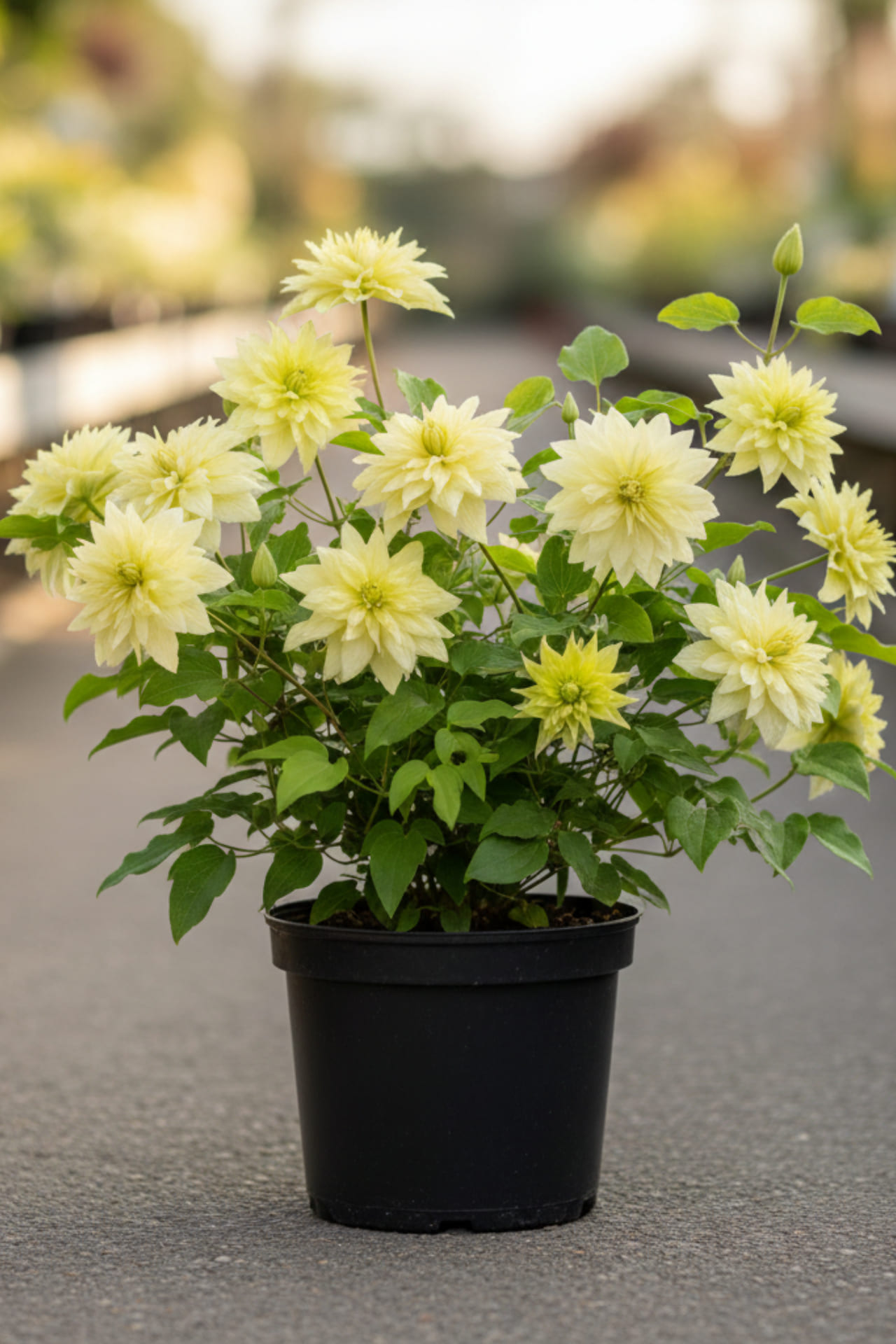 - махровые, очень крупные для группы Атрагене (диаметром 10-12 см), светло-лимонного цвета, во время распускания бутонов – зеленоватые, а когда полностью распустятся белеют, колокольчикообразные, свешивающиеся, приятно пахнущие грейпфрутом.