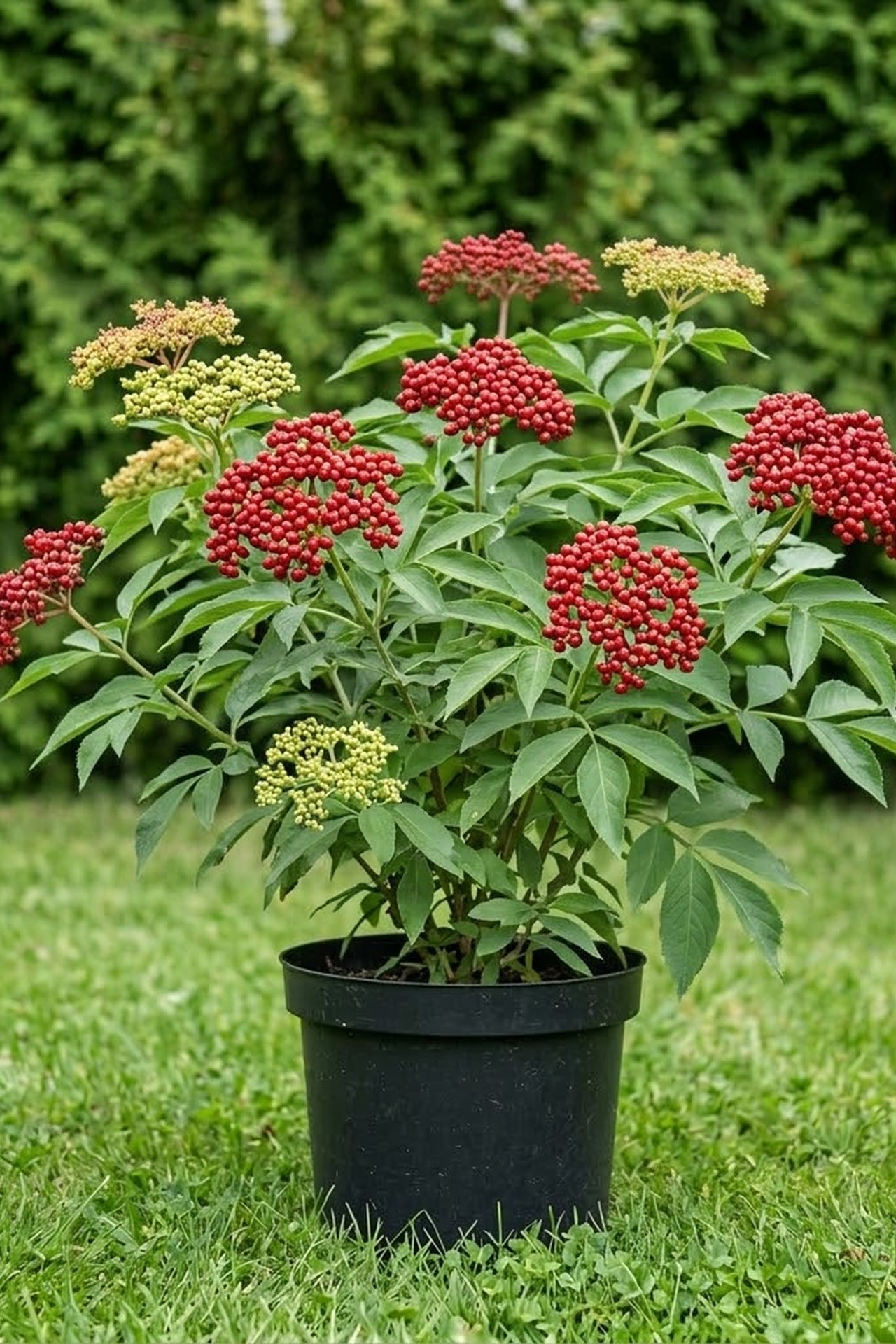 - Цветки зеленовато-желтые в густых, яйцевидных или продолговато-яйцевидных соцветиях, до 6 см в поперечнике; продолжительность цветения 15-20 дней; плоды - ярко-красные, мелкие, ягодообразные, в плотных гроздьях