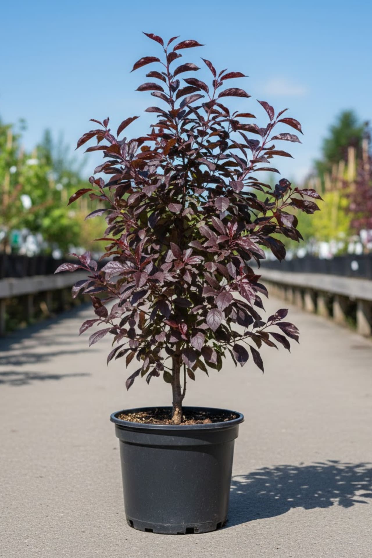 - Листья эллиптические, с металлическим блеском, от красновато-бронзовых до чёрно-красных в течение всего сезона. Цвет осенью не изменяется.