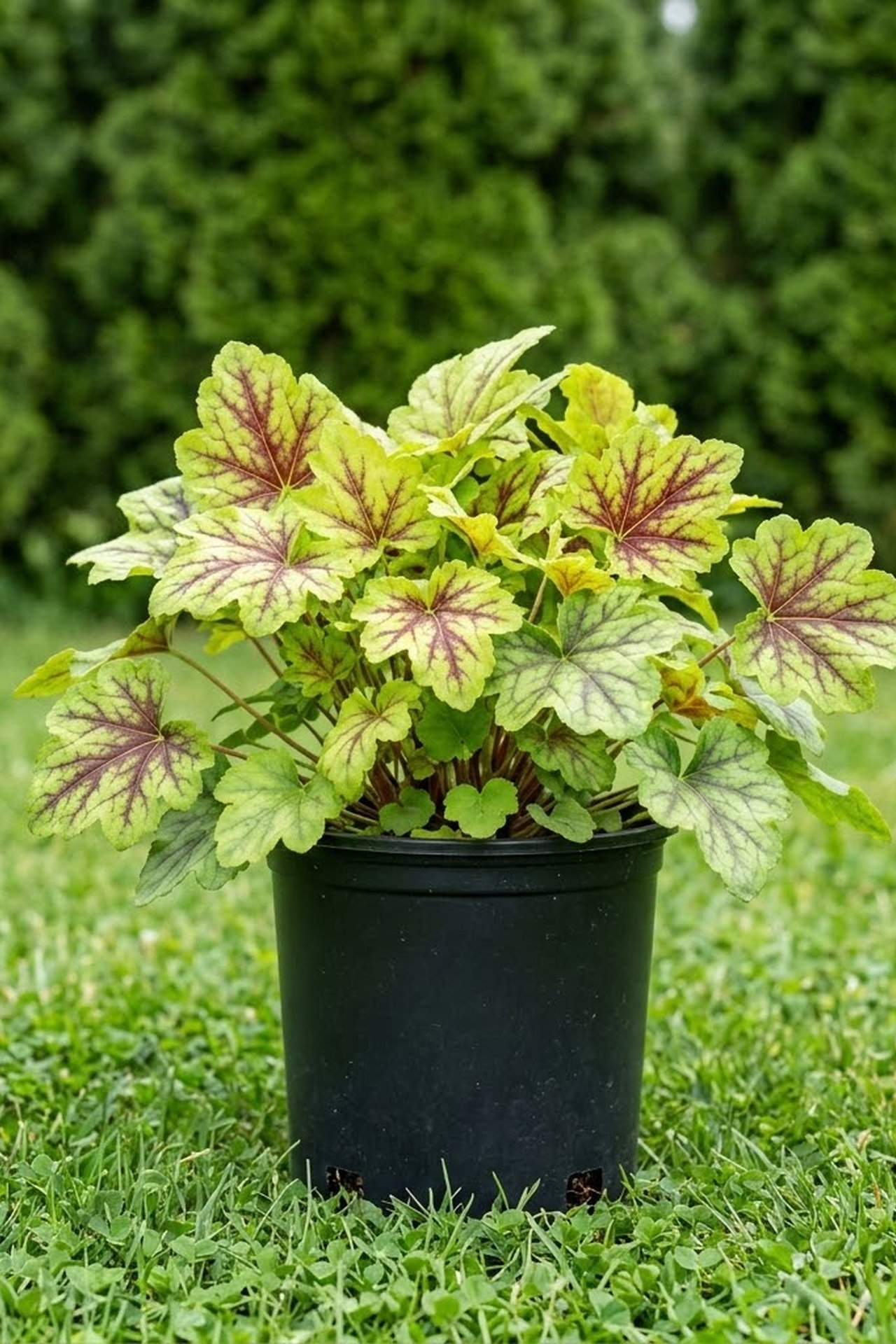 - листья широкие, светлые зелёно-желтые с темно-бордовым центром. Цветы белые.