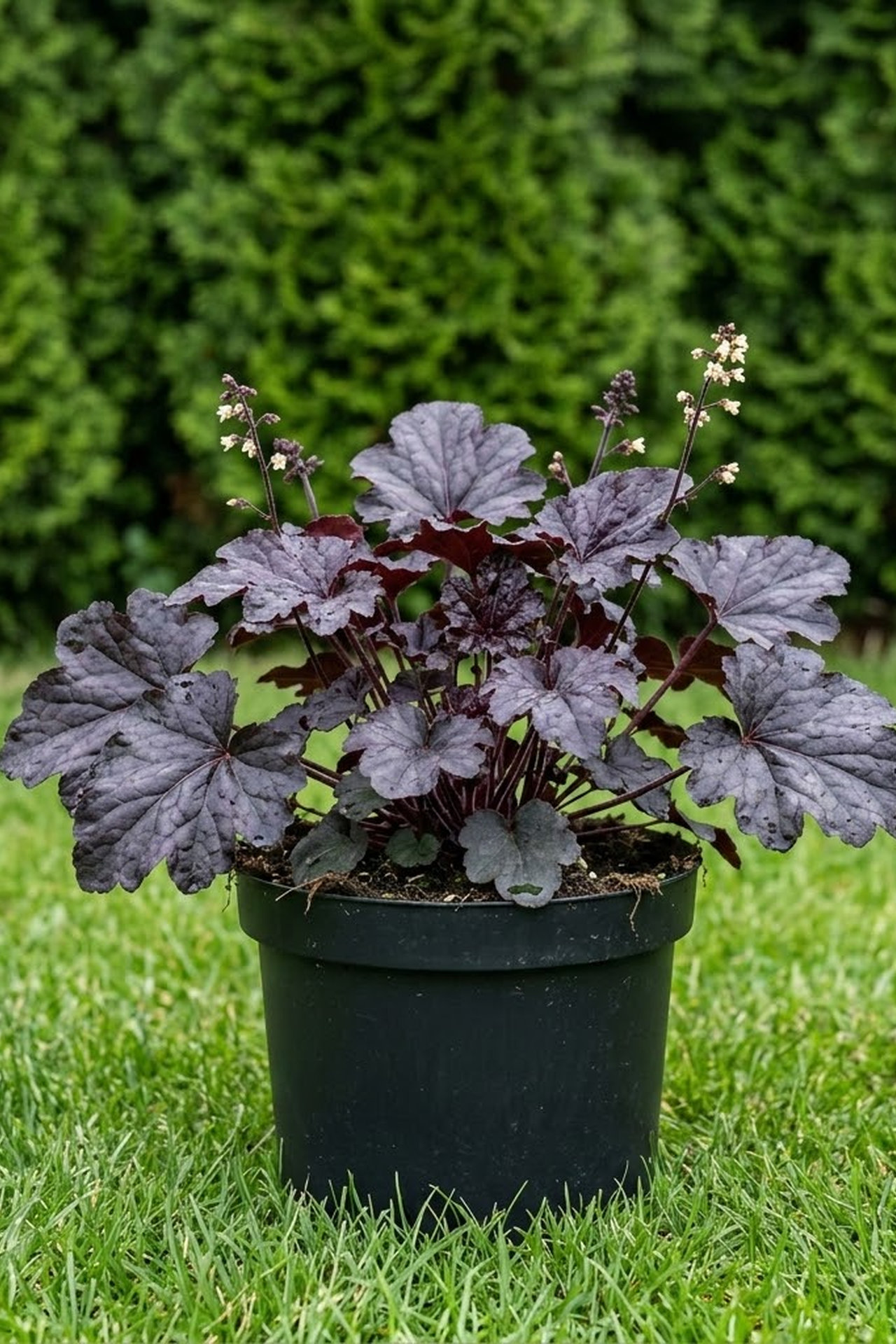 - У гейхеры Блэкаут глянцевые, крупные, округлые листья, темно-серого , почти черного цвета, которые остаются темными в течение всего вегетационного периода.