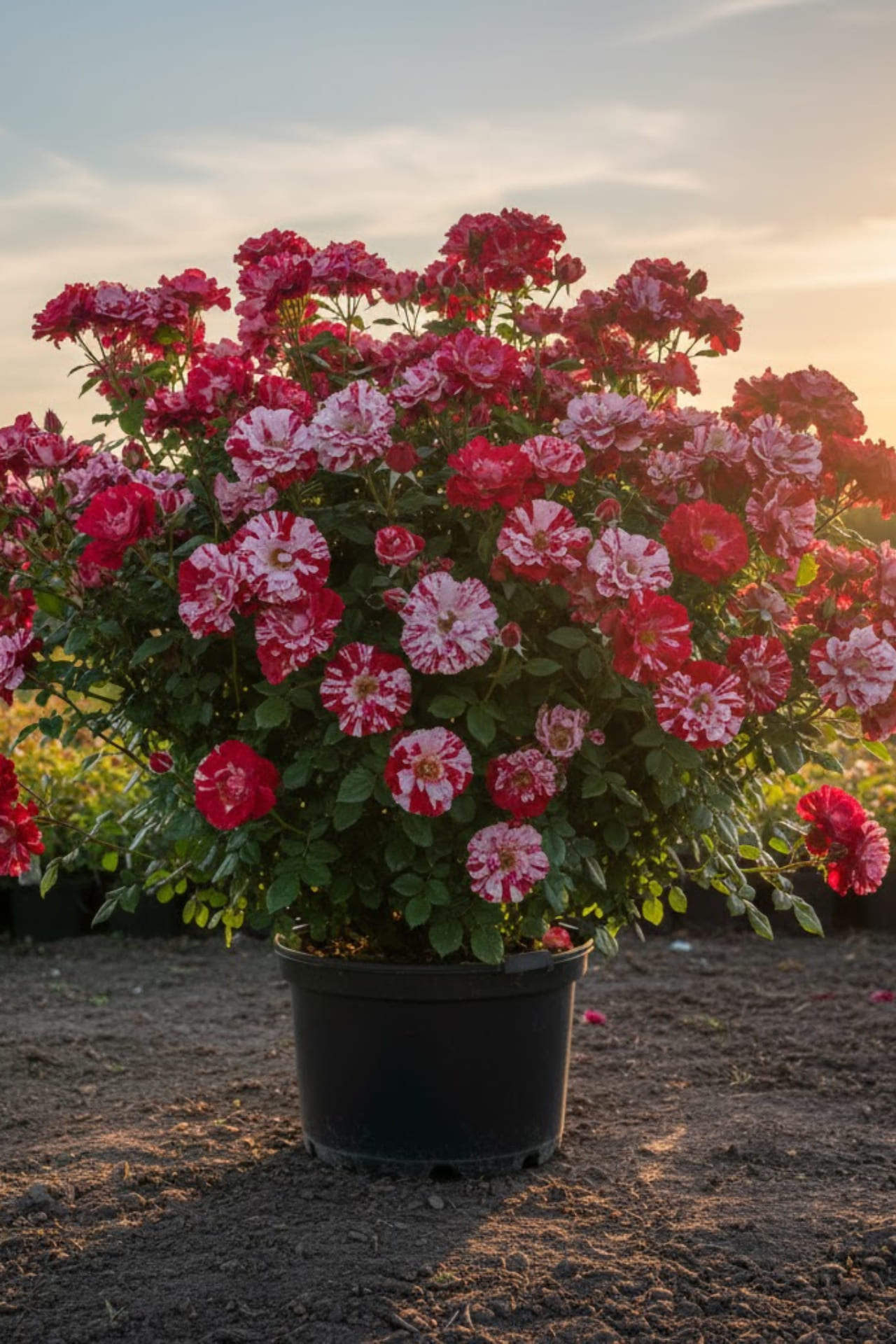 - темно-красный с розовыми полосами и пятнами, чашевидный, махровый, 20 - 25 лепестков в одном цветке, диаметр цветка 5 - 6 см, обладает легким ароматом с нотками малины.