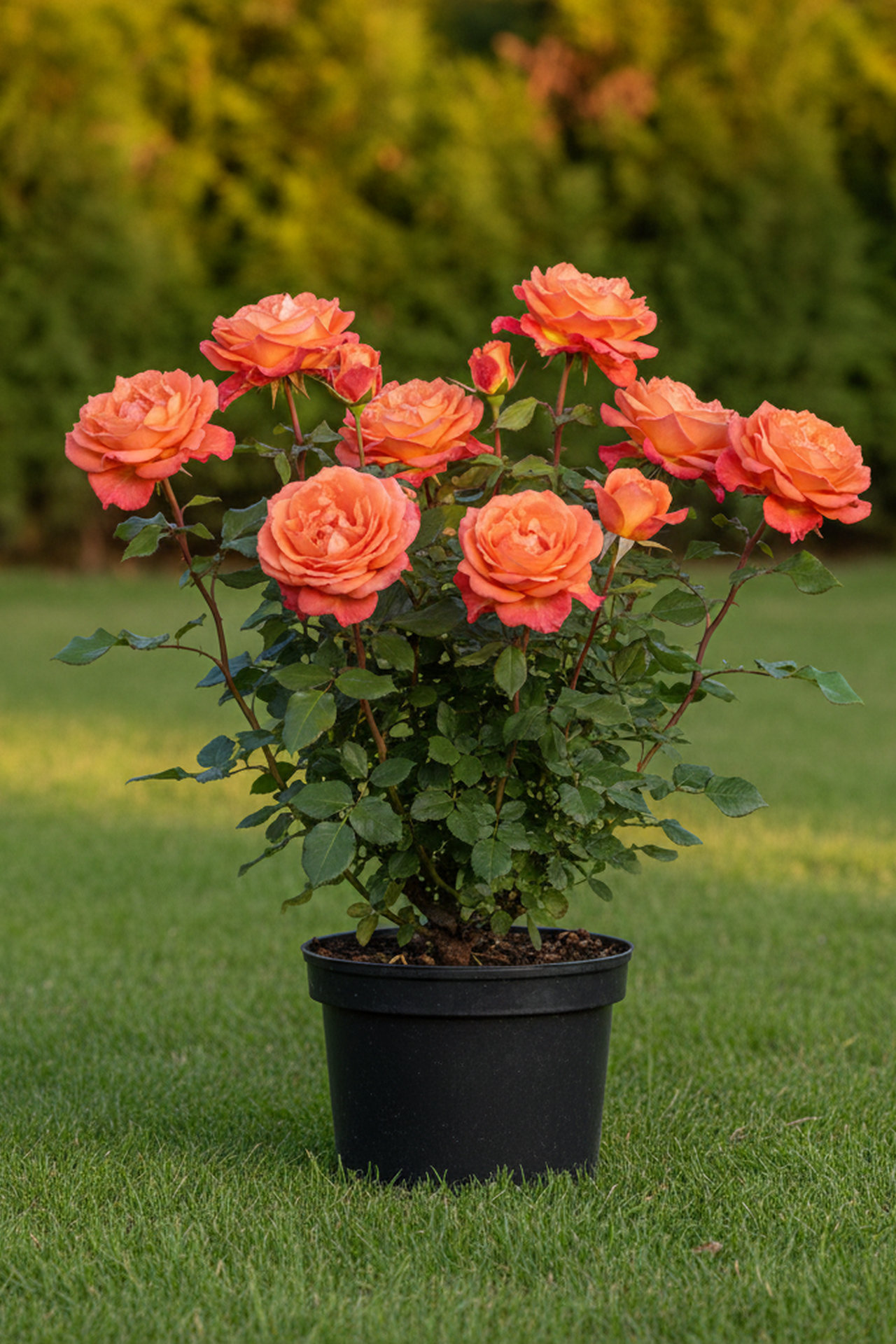 - Цветки оранжево-персиковые, очень крупные, 10-12 см в диаметре, густомахровые, долго держатся на кусте